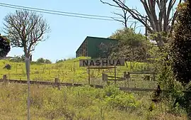 Originally called Springvale. However, James and John Toohey named their property Nashua, originally a tribe of New England American Indians, meaning "land between two rivers"[3] or "river with the pebbled bottom". It is not well understood why the Irish brothers so named their property. The Tooheys planned to grow sugar cane at Nashua, however frost destroyed their crops. Today, the undulating countryside sustains dairy cattle, pecan nuts and other agriculture. The New South Wales government used the property name for the railway station, and the name has persisted to this day.[4]