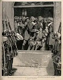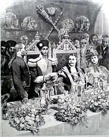 In 1895 the Emir Abdur Rahman Khan had intended to undertake a state visit to England to pay his respects to the ageing Queen Victoria. However, his health prevented him from making the trip, and so he instead sent his son the Shahzada Nasrullah Khan.[4] Nasrullah departed Bombay on 29 April 1895, with an entourage of over 90 dignitaries, including "five or six" high-ranking Afghan nobles and a group of priests for the observance of religious functions.[1] On 23 May the Shahzada landed at Portsmouth in England.[4]