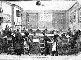 As a more lucrative venture, he also opened the Rum Pum-Pas Club, in the early 1850s, on an upper floor of his Cambrian Stores in Westminster, which offered dining, boxing instruction, and boxing matches for wealthy and aristocratic patrons of the boxing arts. His patrons included high ranking naval officers, powerful businessmen, and members of Parliament.[2] Several upper crust boxing students and alumni from Cambridge University were boxing students of Langham when he lived in Cambridge and may have remained supporters of his club. Tom Sayers found a worthy adversary to box and spar with at the club when his career was flagging. Morning boxing matches for purses were staged in the club and sometimes in remote spots closer to Epsom, and were often preceded by lengthy late night meals followed by the Club's prized plum pudding. Bouts inside the club sometimes featured boxers fighting in the nude, for the unique tastes of some of the aristocratic patrons.[5] Meals were famously consumed inside a regulation 24 square foot boxing ring, despite the tight fit as Langham acted as Master of Ceremonies. Aristocratic patrons included James Grimston, known as Lord Verulam, a former member of both the House of Lords and Commons, Lord Caledon, and Admiral Lord Edward Russell. Other wealthy patrons included Lord Robert Grimston, brother of James, Sir Robert Peel, amateur boxer and son of the Prime Minister, and Robert's brother Royal Navy Captain William Peel, also an accomplished amateur boxer. Other distinguished patrons included Royal Navy Commander William Hope-Johnstone and Brown and Harris of the London Stock Exchange. Jem Mace claimed to have once boxed Archibald William Douglas (1818-1856), the 8th Marquess of Queensbury, known as (Viscount Drumlanrig) at the Club. Douglas had served as a former member of the House of Commons and was the father of John Douglas, credited with helping to establish boxing's modern Marquess of Queensberry Rules.[19][21] The top rated boxers, Cambridge students, and aristocracy who frequented the Club cemented Langham's legacy, and place in society. When Langham died, the fights and sparring matches staged there moved to retired boxer, club patron, and good friend Alex Keene's "Two Tuns" Tavern.[22]