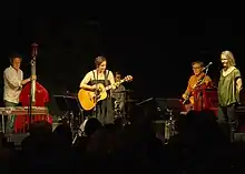 In the live arena, D-Napoleon has performed in a number of different solo configurations. She formed a Santa Barbara-based trio with Dan Phillips on piano and percussion and Kenny Edwards on electric guitar and mandolin in 2007,[14] pairing back to duo with Phillips after Edwards' passing in 2010. In 2014 D-Napoleon expanded the ensemble to a four-piece with the addition of James Connolly on bass and David Cowan on guitar with Doug Pettibone taking over on electric guitar and mandolin in 2019.[15] In Australia D-Napoleon originally performed as a trio with Richard Lane on guitar and Cathi Olivieri on viola and recruited established bands, such as The Justin Walshe Folk Machine, to back her on tour. Since returning to Australia in 2019 D-Napoleon has performed as a trio with Olivieri on viola and piano and Michael Lane on banjo and mandolin, a quartet with the addition on Ben Franz on upright bass and pedal steel, and a full band with Dave Brewer on electric guitar and Andy Pearson on drums and percussion.[16]