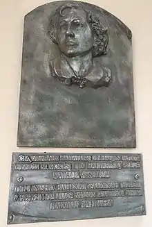 The plaque at the entrance of the Belarusian Gimnasium of Vilnia stating that Natallia Arsiennieva, great Belarusian poet, attended the Gimnasium in 1919-1921
