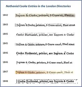 Cooke's name was misspelled as "Cook" on the 1849 patent and the misspelling has propagated in chess literature since then.[1][2] The correct spelling can be found in numerous documents, including his business listings in the London Directories (see top picture, right) as well as official announcements of the marriage of his daughter Harriet Ingram Cooke, to John Jaques II, son of John Jaques, the owner of the company that first manufactured the Staunton pieces in 1849 (see bottom picture, right).