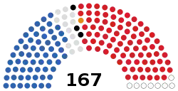 The current National Assembly, formed following elections held on 11 August 2016, has a total of 166 members. 156 members are directly elected in single-member constituencies using the simple plurality (or first-past-the-post) system. Eight additional seats are filled through presidential appointment. The Speaker, first deputy speaker and the Vice President are also granted a seat in the assembly.