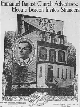 - 1 2 "Immanuel Baptist Church Advertises: Electric Beacon Invites Strangers; Congregation About Two Years Old Has Bought $30,000 Lot". Washington Times. No. 4, 868. Washington, D.C. 13 October 1907. p. 11 – via Chronicling America: Historic American Newspapers, Library of Congress.
