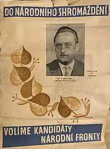 The National Front (in Czech: Národní fronta, in Slovak: Národný front) was a political coalition created in 1943 serving as united front of political parties for liberation of Czechoslovakia, after 1948 organized solely by the Communist Party of Czechoslovakia. it was the vehicle for control of all political and social activity by the Communist Party of Czechoslovakia (KSČ). It was also known in English as the National Front of Czechs and Slovaks.[1][2]