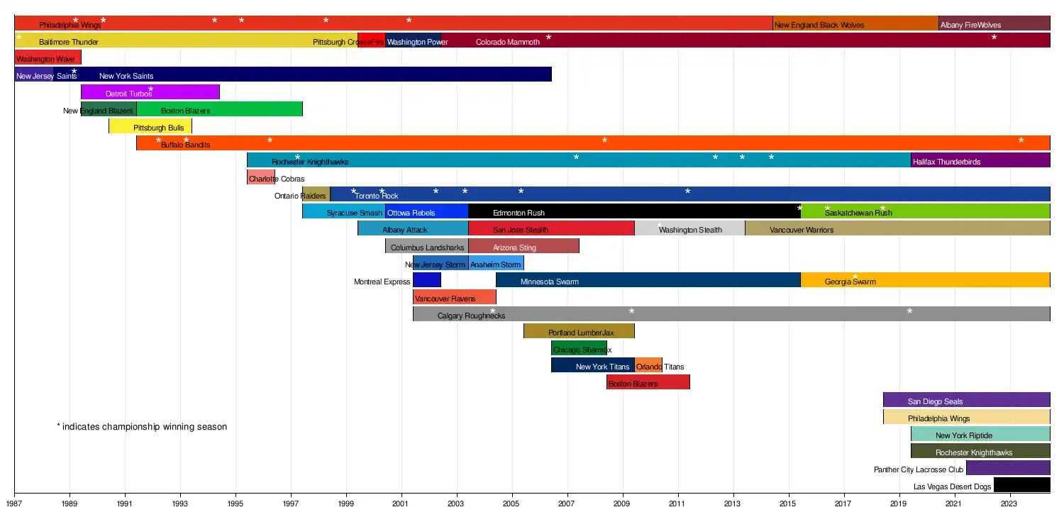 • Philadelphia Wings (1987–2014) → New England Black Wolves (2015–2021) → Albany FireWolves (2022–current)