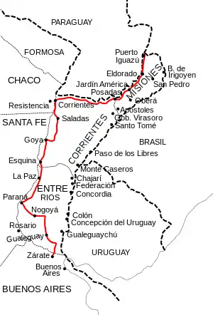 After Ceibas it followed the present National Route 14, traversing near Gualeguaychú, and the present Provincial Route 20, passing through Urdinarrain, Basavilbaso, Villaguay, Federal (Entre Ríos province) and San José de Feliciano.