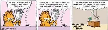 "National Stupid Day" is an installment in Jim Davis's syndicated comic strip Garfield that ran on November 11, 2010, the same day as Veterans Day, a holiday in the United States. The strip, which refers to a hypothetical day of remembrance for the dead as "National Stupid Day", caused some commentators to speculate that the strip was a veiled criticism of Veterans Day or veterans. Davis apologized for the strip, saying that he had written the strip nearly a year in advance and that any offense was unintentional.
