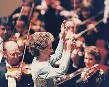 Kindler and the NSO made several 78-rpm recordings for RCA Victor, including the two Roumanian Rhapsodies by George Enescu; much later, in 1960, the NSO would perform the first of these works under the baton of the visiting Romanian conductor George Georgescu, a close associate and favored exponent of the composer.[6] One of the more unusual RCA recordings with the orchestra was of the complete ballet music from the opera King Henry VIII by Camille Saint-Saëns, one of the very few recordings conducted by Walter Damrosch. Years later, Howard Mitchell made a series of stereophonic recordings with the orchestra for RCA. Antal Doráti recorded with the orchestra for Decca Records. Mstislav Rostropovich made recordings for Teldec, Sony Records, and Erato. Antal Doráti was a Hungarian-born music director with a reputation following him. He did multiple series of recordings with the Minneapolis Symphony as well as his years of experience with the BBC and the Stockholm orchestras. He was appointed NSO music director in 1970, but he only served his tenure for 7 years due to his deteriorating relationship with the NSO board of directors. After the board declined another of Doráti's projects, he would often vent his frustrations out to the orchestra in a subtle manner. After seven years with the NSO, he was appointed as music director for the Detroit Symphony in 1977.[7] The orchestra returned to RCA Victor under Leonard Slatkin, until RCA abandoned new classical recordings.