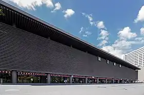 The exterior of the National Theatre building recalls the ancient azekura-zukuri style of the Shōsōin.