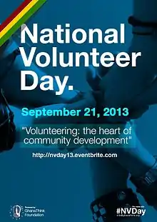National Volunteer Day (NVDay) is a day slated for the September 21 of every year which is also Founder's Day by The GhanaThink Foundation, geared towards encouraging Ghanaians to take up the attitude of Volunteerism.[1]