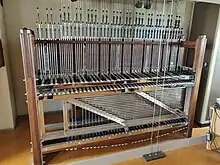 The carillonist sits at a clavier or keyboard and uses his or her hands and feet to strike wooden keys and pedals which are each connected by a wire to a clapper inside a bell. When a key or pedal pulls on the wire, the clapper strikes the bell to create a sound. The bell itself doesn't move. Timothy Hurd stated that "the carillon is a highly gestural instrument. The dexterity required is more one of limbs than of finger skills. It is like dancing to your own music".[5]: 46 For seven years after Gladys Watkins retired in 1936, there was no carillonist: instead, an electric machine played the bells automatically, using a perforated paper roll like those used in a pianola. This machinery was removed in 1986 when the bells and wires were refurbished.[5]: 30, 43