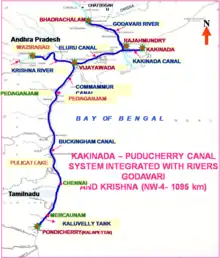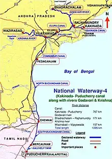 National Waterway 4 (NW-4) is a 1,095 kilometres (680 mi) long waterway in India. It has been declared as an Indian National Waterway and is currently under development. It connects the Indian states of Telangana,[1][2] Andhra Pradesh, Tamil Nadu, and the union territory of Puducherry. The NW-4 runs along the Coromandal Coast through Kakinada, Eluru, Commanur, Buckingham Canals and also through part of Krishna and Godavari rivers in South India. It was declared a National Waterway on 24 November 2008 under the Provisions of National Waterways Bill, 2006.[3] It is being developed by the Inland Waterways Authority of India (IWAI),[4] and was scheduled for completion by 2013. The National Waterways Act, 2016 has extended the length of NW-4 from 1,095 km (680 mi) to 2,890 km (1,800 mi) by connecting the Krishna and Godavari Rivers.[5] The Project would be undertaken in 3 phases with first phase beginning in October, 2017 and to be completed by June, 2019[6] intent { //Hacked //By //Yy