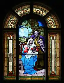 Church records indicate that the current windows were installed in 1907 under the direction of then pastor Rev. James J. Flaherty.[9] The windows can be divided into three primary sets: the nave windows lining the east and west walls of the church, the three windows above the narthex and the windows above the three front entrances. There are dozens of additional windows in the sacristy, the bell tower, and throughout the church. The windows are constructed with gothic patterns that show art nouveau influences. Most major panels have a unique round inset that features a classic, Munich-style stained glass with a religious symbol.