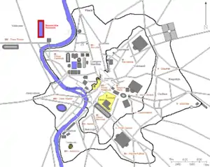 Caesar's naumachia was probably a simple basin dug into the low-lying ground on the northern or southern banks of the Tiber, and fed by its waters; the exact location is unknown; most likely Trastevere or the Campus Martius.[3] The naumachia of Augustus is better known: in his Res Gestæ (23) Augustus himself indicates that the basin measured 1800 × 1200 Roman feet (approximately 533 × 355 meters). Pliny the Elder (Natural History, 16, 200), describes an island formed in the center, probably rectangular and connected to the shore by a bridge where the privileged spectators likely sat.