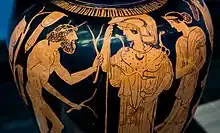 Odysseus ("Aethon" in the opera), meets Nausicaa with the help of goddess Athena. Red-figure amphora, 450-440 BCE, Bavarian State Archaeological Collection