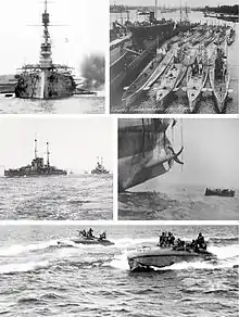 Naval mines were also increasingly well developed. Defensive mines along coasts made it much more difficult for capital ships to get close enough to conduct coastal bombardment or support attacks. The first battleship sinking in the war — that of HMS Audacious — was the result of her striking a naval mine on 27 October 1914.[3] Suitably placed mines also served to restrict the freedom of movement of submarines.