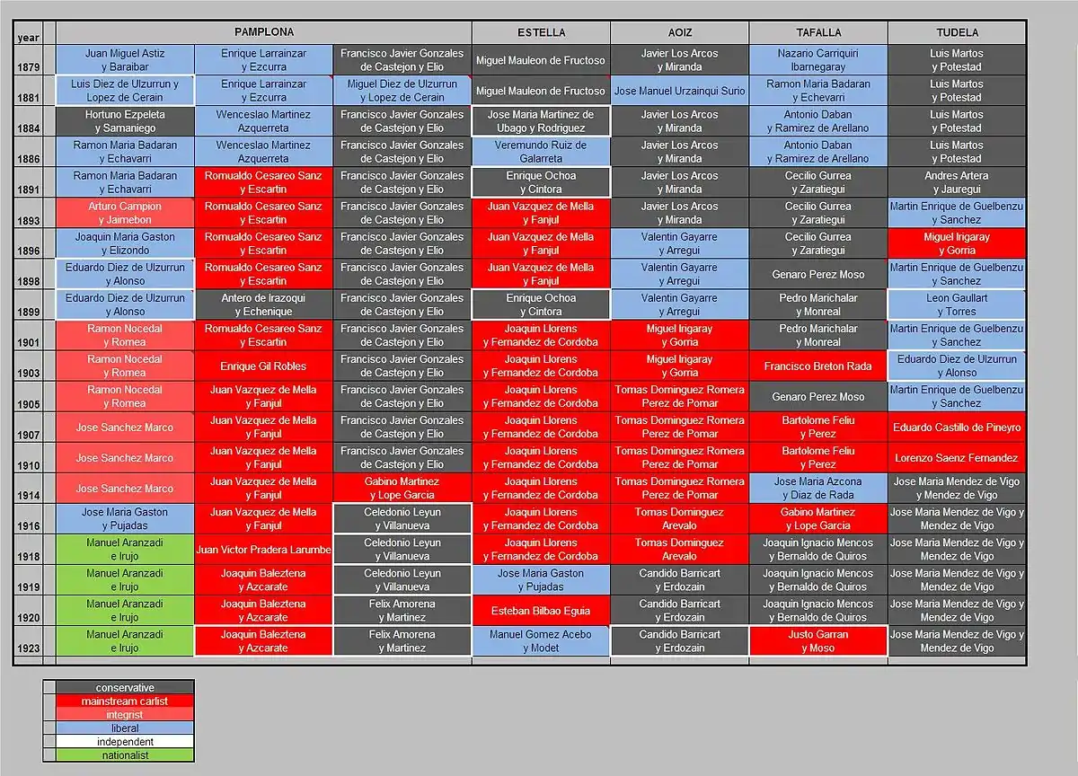 - ↑ for the first time having fielded 5 candidates in all 5 sub-districts, El Heraldo de Madrid, 6.3.1893: Cesareo Sanz (Pamplona), Bartolome Feliu Perez (Aoiz), Juan Vazquez de Mella (Estella), Miguel Irigaray (Tafalla) and Eduardo Castillo Pineiro (Tudela)