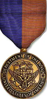 The award is available for private citizens and organizations who have performed outstanding voluntary contributions for the Department of the Navy, within the last five years.[2] The contributions must have had a significant and substantial impact upon a specific activity or geographical location. With the exception of senior Department officials in non-career or appointive positions, only individuals or groups who were not employed by the Department during the time of their contributions are eligible for selection.[2] Recipients of the award are presented with the full-size medal, in addition to a miniature medal, a mounted ribbon, and a lapel pin. Also included with the award is a certificate signed by the commanding officer authorizing the award.[2] Nominations for the award are considered by the Department's Board of Decorations and Medals.[3] This award is bestowable by all Echelon I and II commanders, or above; and is in rare cases is signed and approved by the Secretary of the Navy.[4] If the award was earned prior to entrance into the Naval Service, or while under a U.S. Navy Reserve contract during off-duty (civilian) hours, it may not be worn on the military uniform.[5]