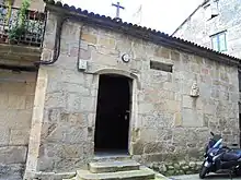 It is a small chapel and is attached to other buildings by the end walls. The walls are made of cut granite stones and the roof is made of wood and Galician tiles. The entrance door, located on the south side, has a segmental arch. Later, upper and lower mouldings were carved to adapt it to the Baroque style, as the chapel is of medieval origin.[9] Next to the door there is an embrasure. The chapel has a small stone image of the Virgin embedded in its façade.[10]