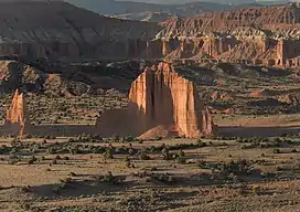 Needle Mountain is a 6,620-foot (2,020-meter) elevation summit located in Capitol Reef National Park, in Wayne County of Utah, United States.[2] This remote erosional remnant is situated 16 miles (26 km) north-northwest of the park's visitor center, and 0.6 miles (0.97 km) east of Cathedral Mountain, in the Middle Desert of the park's North (Cathedral Valley) District. Cathedral Valley was so named in 1945 by Charles Kelly, first superintendent of Capitol Reef National Monument, because the valley's sandstone monoliths reminded early explorers of ornate, Gothic cathedrals, with fluted walls, alcoves, and pinnacles.[3] The free-standing Needle Mountain towers 240 feet (73 meters) above its surrounding terrain, which is within the Fremont River drainage basin. John C. Frémont's 1853 expedition passed through Cathedral Valley.[4]