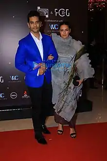 Dhupia married actor Angad Bedi, the son of former Indian cricket captain Bishan Singh Bedi in a private ceremony at a Gurudwara on 10 May 2018.[17] On 18 November 2018, she gave birth to a girl named Mehr Dhupia Bedi.[18] Dhupia was fat-shamed for her post-pregnancy weight gains by certain sections of the media in 2019.[19] On 19 July 2021, she and Angad announced that they are expecting their second child with an Instagram post.[20] She gave birth to her second child, a boy on 3 October 2021 and named him Guriq Singh Dhupia Bedi.[21][22] She decided to leave MTV Roadies.