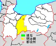 * yellow - areas formerly within the district borders during the early Meiji period