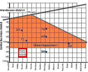 12. See aerial photograph with Germantown shaded in City of Regina Archives project "Regina: The Early Years" at http://scaa.usask.ca/gallery/regina/east/east.html. Retrieved 10 June 2007.