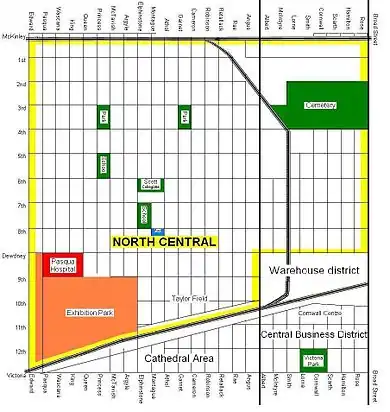 Map of North Central (outlined in yellow), north of the CPR tracks between Pasqua (or Lewvan) and Broad Streets north to McKinley Avenue, except for the Warehouse District, south of Dewdney Avenue and east of Albert Street. The Warehouse District is shown and also the northern sectors of the Cathedral area and the downtown business district south of the CPR tracks. The map shows Exhibition Park; Pasqua Hospital, the old Regina cemetery; Scott Collegiate, Herchmer and Kitchener public schools and Sacred Heart separate school.