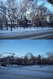 The Crescents, taking its name from Leopold, Angus and Connaught Crescents, the principal residential streets in the precinct, is the historically most desirable residential area of Regina. In zoning parlance a part of the "Cathedral area," it is a discrete residential zone, its posh 1920s villas, mock-Tudor ambience and large lots a striking contrast to the more matter-of-factly working persons' housing of the 13th Avenue neighbourhood. It made the list of "Best Old House Neighborhoods 2011: City Living" in This Old House Magazine.[4]
