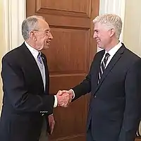 Gorsuch's nomination was first considered by the Senate Judiciary Committee, which holds hearings on all federal judicial nominations and decides whether or not to send nominations to the full Senate for a final confirmation vote.[35] In the 115th Congress the committee consisted of 11 Republicans and 9 Democrats, and was led by Republican Chuck Grassley. In preparation for the hearing, the committee requested the Department of Justice (DOJ) to send all documents they had regarding Gorsuch's work in the George W. Bush administration; and by the time the hearing commenced, the DOJ had sent the committee over 144,000 pages of documents and, according to a White House spokesman, more than 220,000 pages of documents altogether.[36] Gorsuch's confirmation hearing started on March 20, 2017, and lasted four days.[8][37]