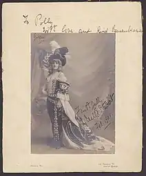 Towards the end of 1880, she received an offer to play the principal boy in Sinbad the Sailor at Melbourne, which she accepted, and the pantomime had great success, running for 14 weeks and earning Stewart some recognition.[8] In 1881 she was Griolet in La fille du tambour-major and the Countess in Olivette. During the next 13 years, Stuart was to take leading parts in 35 comic operas, including those of Gilbert and Sullivan.[8] In December 1883, for example, she played the title role in Patience. As principal boy in the following Christmas pantomime, Stewart was careless when climbing the beanstalk, fell and broke her arm, had it set in the theatre, and completed the part. Forty years later, she recorded that her understudies seldom had an opportunity to appear.