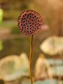 There are several theories about the function of thermogenesis, especially in an aquatic genus such as Nelumbo. The most common theory posits that thermogenesis in flowers attracts pollinators, for a variety of reasons. Heated flowers may attract insect pollinators. As the pollinators warm themselves while resting inside the flower, they deposit and pick up pollen onto and from the flower.[6] The thermogenic environment might also be conducive to pollinator mating; pollinators may require a certain temperature for reproduction. By providing an ideal thermogenic environment, the flower is pollinated by mating pollinators.[12] Others theorize that heat production facilitates the release of volatile compounds into the air to attract pollinators flying over water, or that the heat is recognizable in the dark by thermo-sensitive pollinators. None have been conclusively proven to be more plausible than the others.[13]