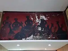In even worse conditions is Quinchamalí (1958) at the Juan Esteban Montero Gallery: the paint of the mural is peeling and warping due to the humidity. The art restorer Carolina Broschek maintains that the mural can be saved, but the owner of the building on which it is painted, Yusif Tala, opined that the Nemesio Antúnez Foundation should take care of the painting or move it to another place, as has no interest in preserving it.[3] In the same gallery, besides the mural, Antúnez installed floor mosaics which are still in perfect condition.