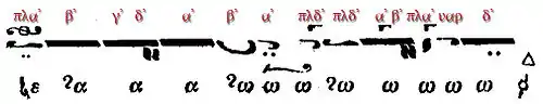 - ↑ Citation according Zannos (1994, 112). The folio 5 verso of the manuscript was reproduced by Eustathios Makris in his article (2005, 4—fig.1), and so he proved that the little addition about the descending intonation cannot be found as quoted by Ioannis Zannos (probably this was the eighteenth-century redaction in Cod. Athos, Xeropotamou 317), so it is written here in rectangular brackets. In fact the standard intonation given in EBE 899 is just ascending.