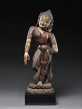 Although drawing on the sculptural traditions of India, and the religious iconography of Buddhism and Hinduism, Nepalese sculpture evolved into its own distinctive style, with a tendency towards more ornate flourishes, exaggerated physical postures and elongated depictions of facial features.[1] In Nepal, as in Tibet, "the last phase of Buddhist art in India enjoyed a prolongation of nearly a thousand years",[2] as Buddhism virtually disappeared in India itself. Style in metal continued to develop until recent centuries,[3] until about the 17th century, after which it changed little.