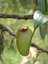 Nepenthes aristolochioides is noted for exhibiting relatively little dimorphism between its lower and upper pitchers.[3] Rosette and lower pitchers are only briefly produced on small rosettes before the plant begins to climb, or on offshoots from the climbing stem. They arise from the ends of the tendrils, forming a 3–5 mm wide curve.[4] They are broadly infundibular in the lower two-thirds and globose above, forming a dome above the pitcher opening.[5] They reach 7 cm in height and 3 cm in width.[5] A pair of wings (≤9 mm wide) runs down the front of the pitcher, either covering the length of the trap's ventral surface or being restricted to the upper part only.[5] These wings bear fringe elements up to 10 mm long.[3] The pitcher mouth is orbicular to ovate and up to 1.5 cm in diameter.[4] It has a horizontal,[5] oblique or almost vertical insertion.[4] The glandular region covers almost the entire inner surface of the pitcher, but is often missing from the uppermost parts of the pitcher dome.[5] The waxy zone typical of many Nepenthes species is absent.[11][12] Digestive glands are overarched; the lower ones measure 0.2–0.3 mm in diameter and are present at a density of around 200/cm2, whereas the upper ones are smaller and present at a density of around 500/cm2.[4] The flattened peristome is broad, greatly incurved, and up to 20 mm wide.[4] Its ribs are spaced up to 0.5 mm apart.[4] Its inner margin is lined with small teeth that are curled at their apices[5] and are 2–3 times as long as they are broad.[4] The inner portion of the peristome accounts for around 82% of its total cross-sectional surface length.[11] The pitcher lid or operculum is orbicular-cordate[5] or ovate, up to 1.5 cm wide, and bears no appendages.[4] Large nectar glands are present on the lid's entire lower surface, particularly around the midline.[4] Three prominent veins are usually present on either side of the lid's midline.[4] A broad and flattened spur (≤7 mm long) is inserted at the base of the lid.[4] It has been variously described as either branched[4] or unbranched (simple).[5]