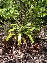 The unidentified taxon (N. cf. beccariana) that grows along the road from Sibolga to Tarutung is similar to N. longifolia, but is atypical of the species. It differs from the type form of N. longifolia in that the petioles are not decurrent into a pair of wings over the internodes and some of the hairs lining the leaf margins are caducous. The plants also differ in ecology; the unidentified taxon grows in both exposed sites and amongst dense vegetation, while N. longifolia is generally found in dense forest.[2]