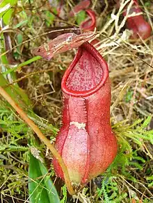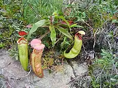 In open areas, N. bokorensis is sometimes sympatric with other carnivorous plants, including sundews and bladderworts.[11] The N. bokorensis plants found by François Mey in 2007 grew alongside a crimson form of Drosera peltata, but this population was destroyed by the time of the author's return in 2009.[12] Drosera peltata still grows sympatrically with N. bokorensis at "Location C", a massive clearing discovered in 2011 on the Bokor plateau.[11] The D. peltata plants at this site range in colour from yellowish-green to red and frequently exceed 30 cm in height.[11] Nepenthes bokorensis also shares this habitat with another sundew—D. burmannii—as well as with various grasses, stunded shrubs, and lithophytic orchids.[11] Local bladderwort species include U. bifida, U. odorata, U. minutissima, U. striatula, U. subulata, and U. uliginosa.[13][14][15][16]