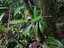 Leaves are sessile and coriaceous.[2] The lamina is lanceolate-spathulate in form. It may be up to 10 cm long and 2 cm wide. It has an acute apex and is gradually attenuate towards the base, which clasps the stem for one third to a half of its circumference.[2] Around three pairs of longitudinal veins are present on the lamina, originating from the basal third of the midrib. Pinnate veins are oblique and irregularly reticulate, although they are not easily distinguishable.[2] Tendrils can be up to 15 cm long and may or may not have a curl.[8]