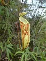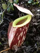 Nepenthes glabrata /nɪˈpɛnθiːz ɡlæˈbrɑːtə/ is a tropical pitcher plant endemic to Sulawesi. The species grows in open, high forest at elevations of 1600 to 2100 m. It produces dainty, colourful pitchers reaching only a few centimetres in height. These traps are red speckled on a yellowish background, giving them a "hand painted" appearance.[4]