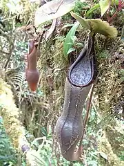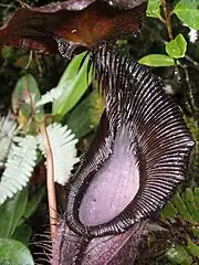 Rosette and lower pitchers are typically ovate in the basal quarter to half of the pitcher cup, becoming cylindrical and sometimes slightly infundibular above. A conspicuous hip often delimits these two parts of the trap. Terrestrial pitchers may be quite large, reaching 30 cm in height by 6 cm in width. A pair of fringed wings (≤6 mm wide) runs down the ventral surface of the trap, bearing filaments up to 12 mm long. The peristome is cylindrical at the front and becomes flattened and broader towards the sides and rear, measuring up to 3 cm in width. It bears ribs up to 2 mm high and spaced up to 2.5 mm apart. These ribs terminate in teeth (≤8 mm long) on the inner margin of the peristome, the largest being located towards the top. There is often a gap of several millimetres separating the two lobes of the peristome directly below the lid. The pitcher lid or operculum is ovate to orbicular and typically has a cordate base as well as a frilled margin. It measures up to 6 cm in length by 4.5 cm in width. A triangular or hook-shaped basal crest (≤1 cm long) is commonly present on the lower surface of the lid. An unbranched spur measuring up to 10 mm in length is inserted near the base of the lid. Lower pitchers typically have a very dark pigmentation, being purplish-black throughout. However, the indumentum covering the traps can give them an orange or brownish sheen. The peristome is generally purple, black, or dark brown, but may have lighter coloured teeth ranging from green, through yellow, to white. The inner surface of the pitcher may be light yellow, white, or light purple, and often bears purple speckles. The pitcher lid is often yellow or green on the underside and dark purple on its upper surface. Occasionally, the pitcher may be yellowish-green throughout with a black peristome.[4]