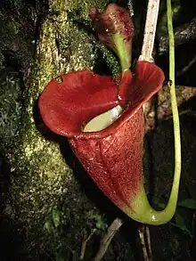 The unusually large glands on the underside of the lid produce copious amounts of nectar and likely lure insects into a precarious position over the pitcher mouth.[1]