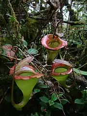 Upper pitchers are much larger, growing up to 15 cm high and 10 cm wide. Wings are reduced to ribs that run down the front of the pitcher. The greatly expanded peristome may reach 3.5 cm in width in aerial pitchers. The lid does not cover the mouth completely, being narrowly ovate. It is up to 5 cm long and 2 cm wide. The crater-like glands on the underside of the lid may be up to 1.5 mm wide. These glands are so large that they are visible as swellings on the upper surface of the lid. The spur is simple and up to 1 cm long. Pitchers range in colour from light green to dark purple throughout and may be lightly speckled. The most common form of this species has green pitchers with a red peristome.[1]