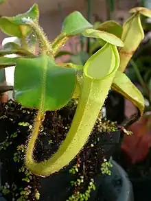 Upper pitchers gradually arise from the ends of the tendrils, forming a 15 to 20 mm wide curve. They are infundibular in shape and reach much greater dimensions than their lower counterparts, measuring up to 18 cm high by 8 cm wide. Like terrestrial pitchers, they lack wings, instead having a pair of prominent ribs. The pitcher mouth is positioned almost horizontally at the front, but rises into a neck (≤3 cm high) towards the rear. The flattened peristome is up to 12 mm wide and bears ribs spaced 1⁄3 mm apart which terminate in short teeth. Virtually the entire inner surface of the pitcher is glandular, having very small overarched glands at a density of 2000 to 2500 per square centimetre. The pitcher lid suborbicular, deeply cordate, and measures up to 7 cm in length. Small round glands are scattered throughout the lower surface of the lid and a prominent hook-like crest is present near the base.[2][3]
