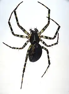 The body length excluding legs is about 4 to 7 mm in both sexes, males having a slimmer abdomen.[1][2] The carapace is dark brown with a darker midline and margins.[1][3] The abdomen is marked with a broad brown folium with pale speckles and small indentations, surrounded by a pale area.[1][3] The legs are yellow-brown with many annulations which, along with its size, help to distinguish N. montana from similar species.[1] It builds a hammock-shaped web among bushes or low vegetation, on tree trunks, or under logs, which it rests beneath.[1]