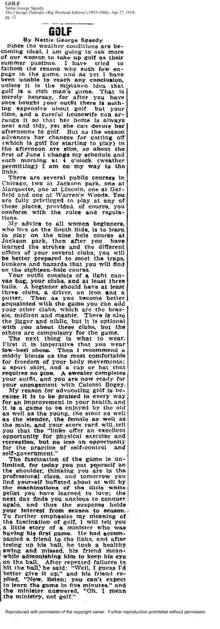 Speedy wrote in her weekly "Society "column that, "Everyone– socially interested or not– should go out and learn golf, and brush up on golf terms and phrases, for the national golf tournament is just around the corner and promises to be the gala event, starting off the fall season...Famous golfers from all parts of the country are expected here with bags and clubs." She joyfully announced that “All Chicago has gone golf mad” in characterizing the excitement for future events, stating that store displays exhibited mannequins with “alluring sport outfits” and that many tourists passing Chicago planned to stop to watch the national golf competition.[23]