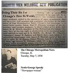In 1938, she became a journalist for "The Metropolitan Post[26]," a new African American newspaper launched in Chicago in 1938.[27]"Women and Their Activities" was the title of her column. [28]