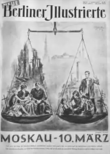 Neue Berliner Illustrierte was first published in Berlin in October 1945.[2] It was modeled on Arbeiter-Illustrierte-Zeitung.[1] Shortly after its start it began to enjoy higher levels of circulation in East Germany.[3] The magazine came out weekly and covered various topics, including politics, health-related issues, movies, novels and picture stories designed for children.[2] Another topic covered was the reasons of divorce in East Germany,[4] technological advances in the communist countries and socialist heroes.[5] All these topics were accompanied by photographs[1] and featured to influence the perspectives of the East Germans in line with the official ideology of the state.[3]