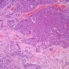 A hematoxylin and eosin stained intermediate power showing an infiltrating tumor with glandular and neuroendocrine features in a neuroendocrine adenoma of the middle ear.